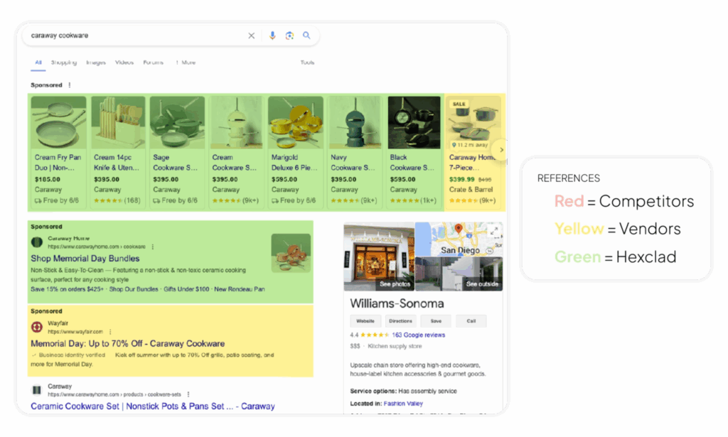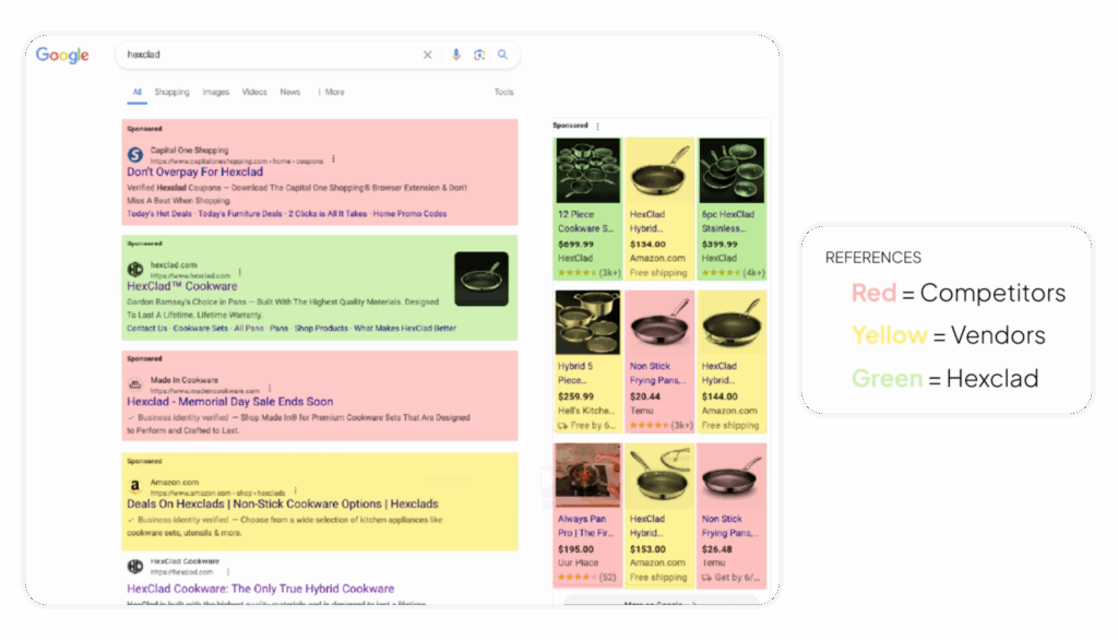 But that’s not the world we live in. Instead, we get competitors, affiliates, and our own retailers bidding against us. Look at this example from HexClad. The SERP is packed with competition. For them, being present in the auction is likely critical to protect their traffic.