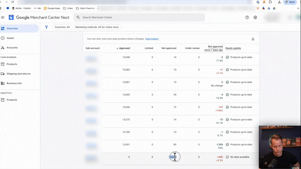 The first tab open is always the Merchant Center Diagnostics page. How many products are active? How many are disapproved or limited? This morning, I did my check and saw a spike in disapproved products. Now I know there’s an issue that needs to be fixed today.