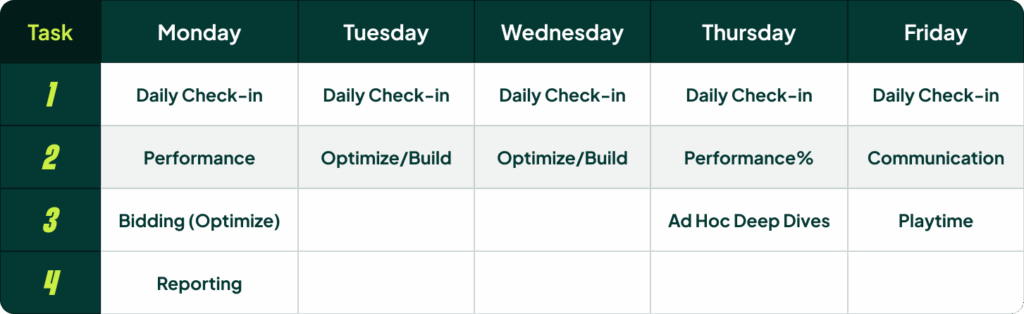 Now, let’s look at the structure. This is an ideal week for someone with complete autonomy managing a single account. We’ll cover how to adapt this for the real world (agencies, in-house teams) in a moment, but this is the template.