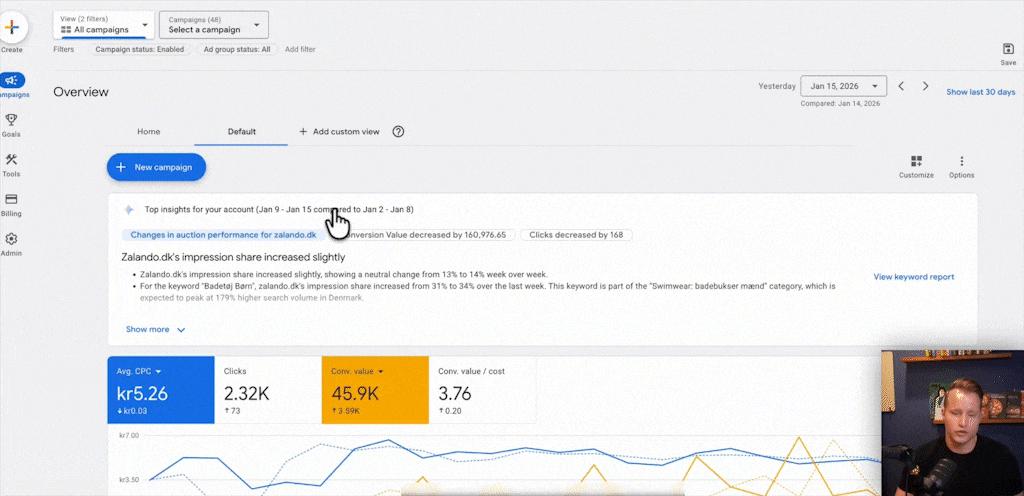 The default Google Ads overview tab is, frankly, a mess. It’s cluttered with irrelevant information like paused campaigns and an optimization score I definitely don’t need. The ability to create a custom default view is a welcome change. I like to build a dashboard that puts actually useful data front and center: search trends, a summary of top campaigns, and the biggest keyword-level changes. It allows me to cut through the noise and see what matters the moment I log in.