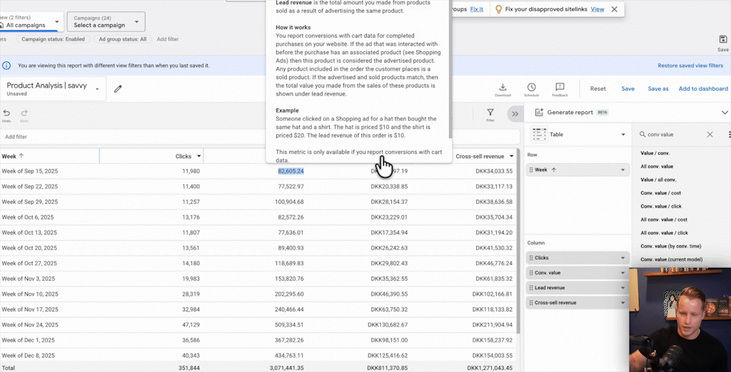 I’ve been banging this drum for years. The standard data in Google Ads is flawed because it only shows you which product was *clicked*, not what was ultimately *purchased*. Cart data fixes this. It splits revenue into “lead revenue” (sales from the same product that was advertised) and “cross-sell revenue” (sales from a different product). When we analyze this, we often see that 70% or more of the revenue comes from cross-sells. This is a goldmine. It tells you which products are effective “door openers” that lead to larger carts. The logical next step is to find these products and bid more for them, because their true value is much higher than what standard reporting shows.
