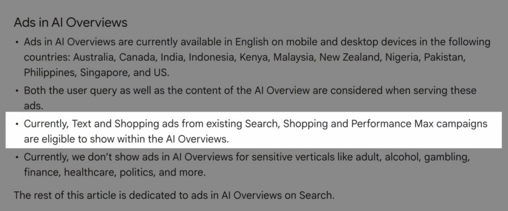 This isn’t really news, but the documentation has been evolving. Initially, it seemed like you needed specific campaign types to show up in AI Overviews. Now, Google has clarified that any text and shopping ads from existing Search, Shopping, and PMax campaigns are eligible. You do not need a special “AI” campaign. The place where this might get more interesting is if Google allows AI to rewrite ad copy on the fly to better match the conversational nature of an AI-powered search, pulling from your product feeds and descriptions to create hyper-specific ads.