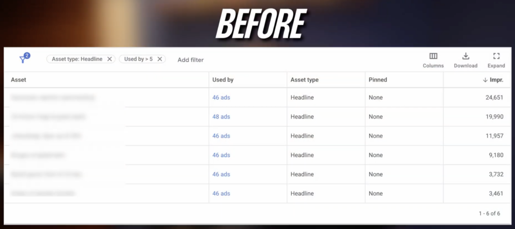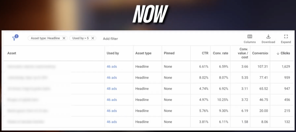This was the gift that keeps on giving from last summer. For years, we were flying blind with Responsive Search Ads, only seeing impression data for assets. Now, we have clicks, conversions, conversion rate, CTR—all the data we need to properly optimize. We can finally go back to the old-school (and effective) way of ad testing: identify headlines with a high conversion rate but low CTR, and pair them with elements that drive clicks. This data brought real ad optimization back to search campaigns.