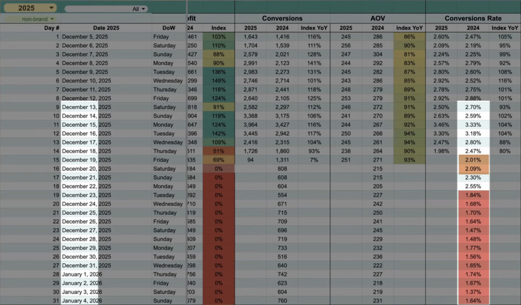 Another obvious example is after your holiday shipping cutoff. Smart Bidding doesn’t know you can’t ship on time anymore. Your conversion rate will plummet overnight. You have to intervene.
