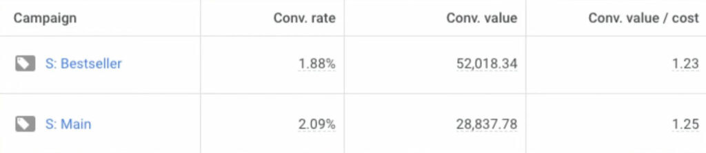 If you set up a complex structure and all the campaigns have the same conversion rate and the same ROAS target, you’ve accomplished nothing. I see this all the time—a “bestsellers” campaign that has a lower conversion rate than the main “all products” campaign. It’s a clear sign the structure is not working and is just making things worse.