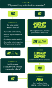 The big one: if you ever plan to use campaign priorities to layer your segmentation later, you have to start with Standard Shopping. There’s no point starting with PMax if you’re going to switch later.