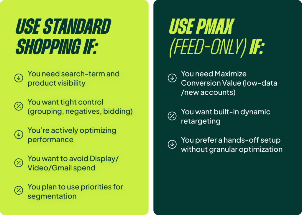 You could use a feed-only PMax campaign if you need to use Maximize Conversion Value bidding from day one, which can be useful for new accounts with limited data. It also includes automatic dynamic product remarketing. If you aren’t planning to touch any of the optimization levers I mentioned for Standard Shopping, then you might as well use PMax.