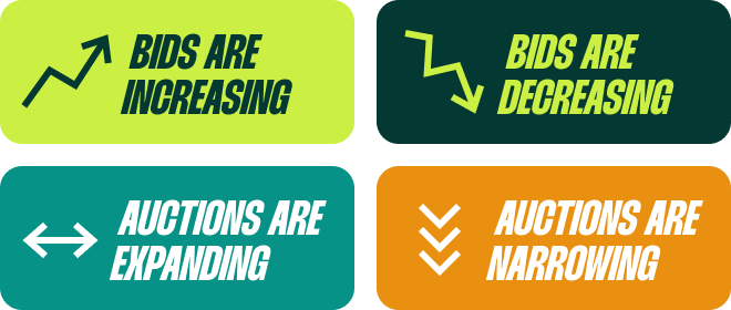 - Du kan diagnosticere fire primære scenarier: Bud stiger, Bud falder, Auktioner udvides eller Auktioner indsnævres.