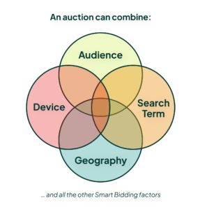 Dette er den del, de fleste specialister fuldstændig overser. Smart Bidding vil også beslutte at deltage i flere auktioner (udvide) eller færre auktioner (indsnævre) baseret på dit mål. En “auktion” er ikke bare en søgeterm; det er en unik kombination af en søgeterm, enhed, målgruppe, geografi og alle de andre signaler, Google bruger.