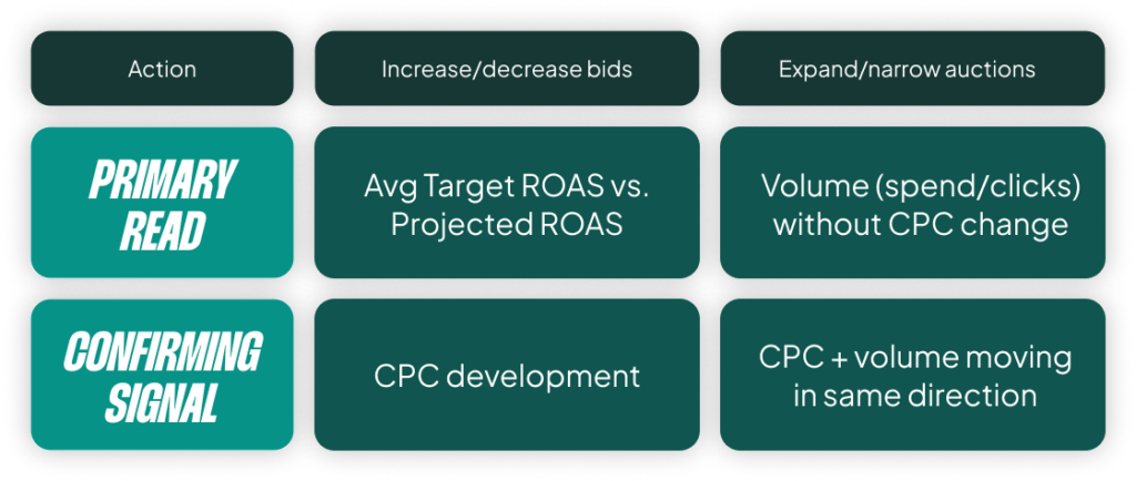 Nu hvor du kan aflæse signalerne, kan du løse paradokset fra begyndelsen. Skal du hæve dit ROAS-mål, når performance falder? Svaret afhænger af, hvad algoritmen allerede er i gang med.
