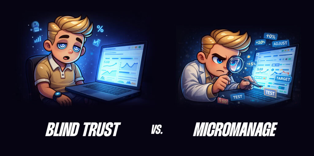 Når det kommer til Googles Smart Bidding, falder de fleste account managers i en af to lejre. Den første lejr stoler blindt på algoritmen. De sætter et mål, går deres vej og håber på det bedste. Den anden lejr mikrostyrer den til døde ved konstant at justere mål og tilføje budjusteringer uden nogensinde at give algoritmen plads til at arbejde.