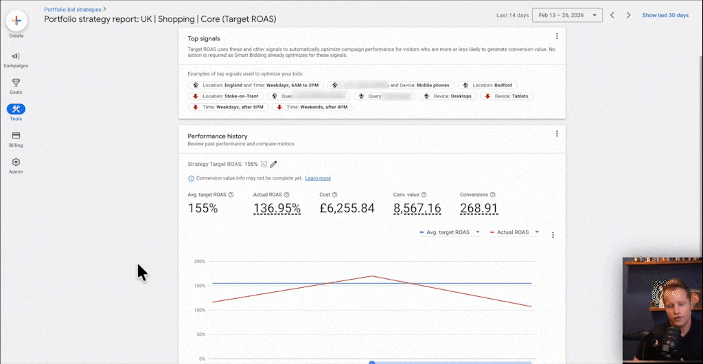 - Performance er begrænset: Hvis din ROAS konsekvent er højere end dit mål, men forbrug, klikpriser og unikke kategorier ikke stiger, bliver du holdt tilbage af en begrænsning. Forøg dit budget eller dine maks. budgrænser, selvom Google ikke markerer dem som “begrænset”.