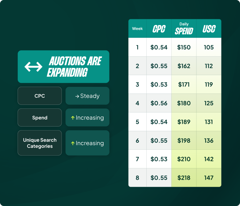 Fortolkningen: Smart Bidding byder ikke højere; den bruger budgettet til at gå ind i nye, bredere auktioner for at finde mere volumen.