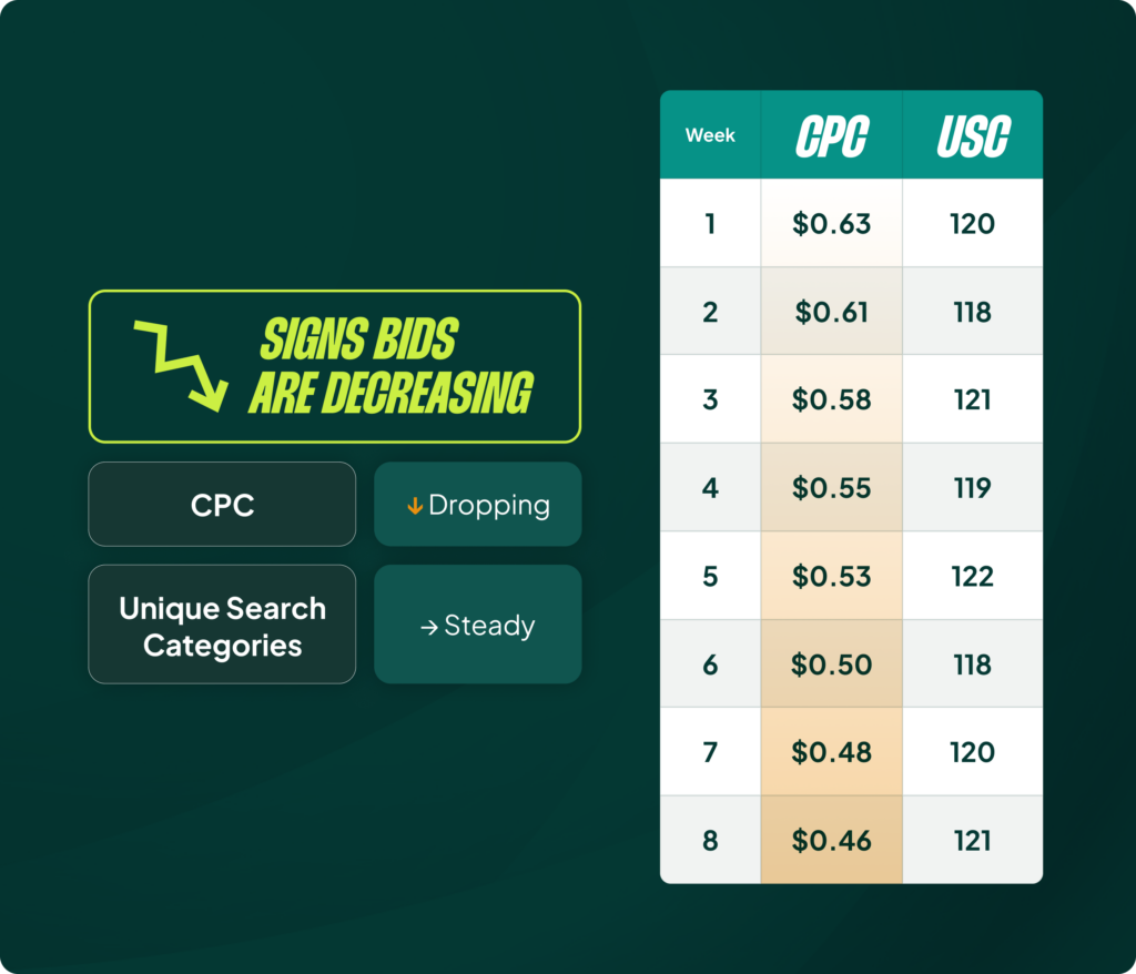 Tegnene: Dit daglige forbrug og antal klik falder, men din gennemsnitlige CPC er stabil. Antallet af unikke søgekategorier falder sandsynligvis.