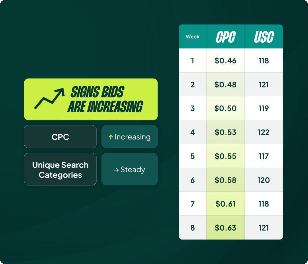 Tegnene: Dit daglige forbrug og antal klik stiger, men din gennemsnitlige CPC er stabil. Dette bekræftes ofte af en stigning i unikke søgekategorier.
