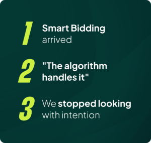 Så kom Smart Bidding. Efter et par år blev vi kollektivt enige om, at “algoritmen klarer det”, og vi holdt op med at se på vores konti med samme fokus. Lad mig sige det igen: vi holdt op med at kigge bevidst.
