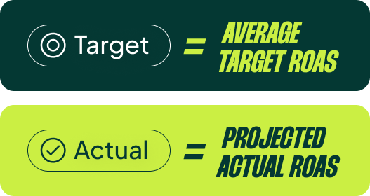 - Faktisk ROAS: Dette er din reelle performance over tidsrammen. Vi sammenligner den med forventningen.