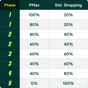 Mens du gør dette, vil du se mere og mere forbrug flytte sig over til Standard Shopping. Når du er på eller tæt på en 50/50-fordeling af forbruget, skal du sætte PMax på pause og lade Standard Shopping overtage helt. Lad dig ikke friste til at lade dem køre parallelt for evigt; du splitter blot din data og skader din performance på lang sigt.