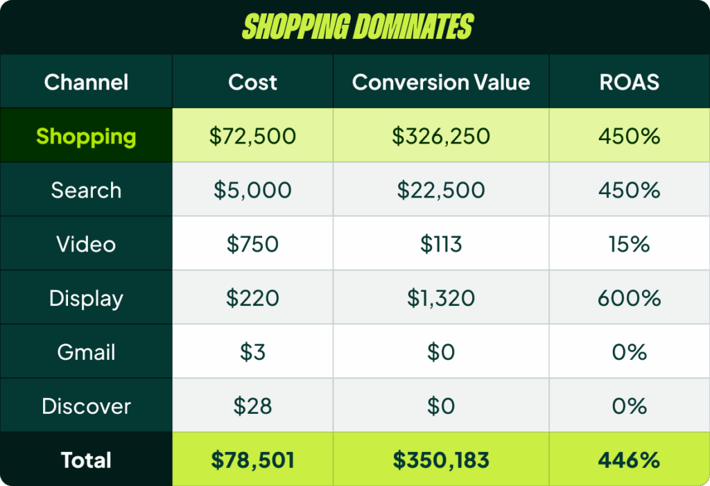Her er det vigtigste: Hvis Shopping trækker det tungeste læs, kan du roligt skifte. Men hvis Search udgør en betydelig del af dine konverteringer, skal du grave dybere. Det samme gælder for YouTube og Display. Hvis de skaber solide konverteringer, kan du ikke bare droppe dem. Du bliver nødt til at planlægge selvstændige kampagner til at overtage den volumen eller beholde PMax uden produkter tilknyttet til at håndtere det.