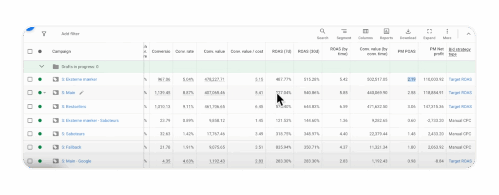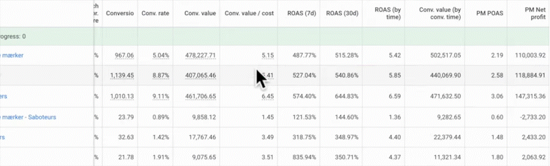 Du kan derefter bruge brugerdefinerede kolonner til at se din POAS og nettoprofit lige ved siden af din ROAS og omsætning. Dette giver dig det bedste fra begge verdener: Du får de afgørende indsigter i, hvilke kampagner og produkter der driver den højeste profit, men du bevarer også den fulde effektivitet og stabilitet fra Smart Bidding, som er baseret på dine mindre volatile omsætningsdata.