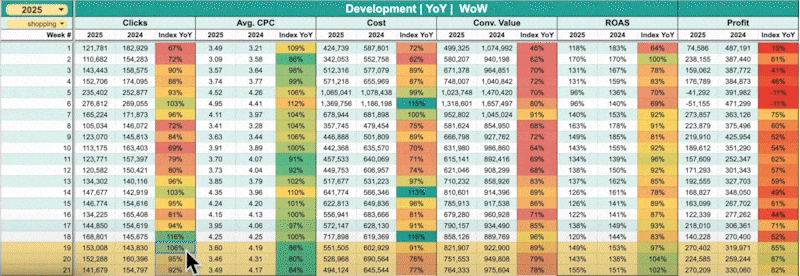 Dette sikrer, at Smart Bidding ikke kan blive for aggressiv, når POAS er god, eller trække sig for hårdt tilbage, når den dykker. Vi har brugt dette til at stabilisere klikpriser og profit for annoncører, der oplevede massive udsving fra uge til uge, og i sidste ende fået dem tættere på deres år-til-år profitmål, mens vi undgik yo-yo-effekten.