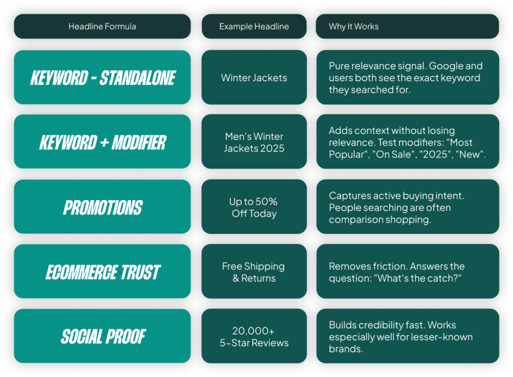 Enhver responsiv søgeannonce bør starte med det, jeg kalder “de fem kerneformler”. Disse er uundværlige, og hver annonce bør have mindst én overskrift fra hver kategori. For det meste er disse fem også dem, der klarer sig bedst.