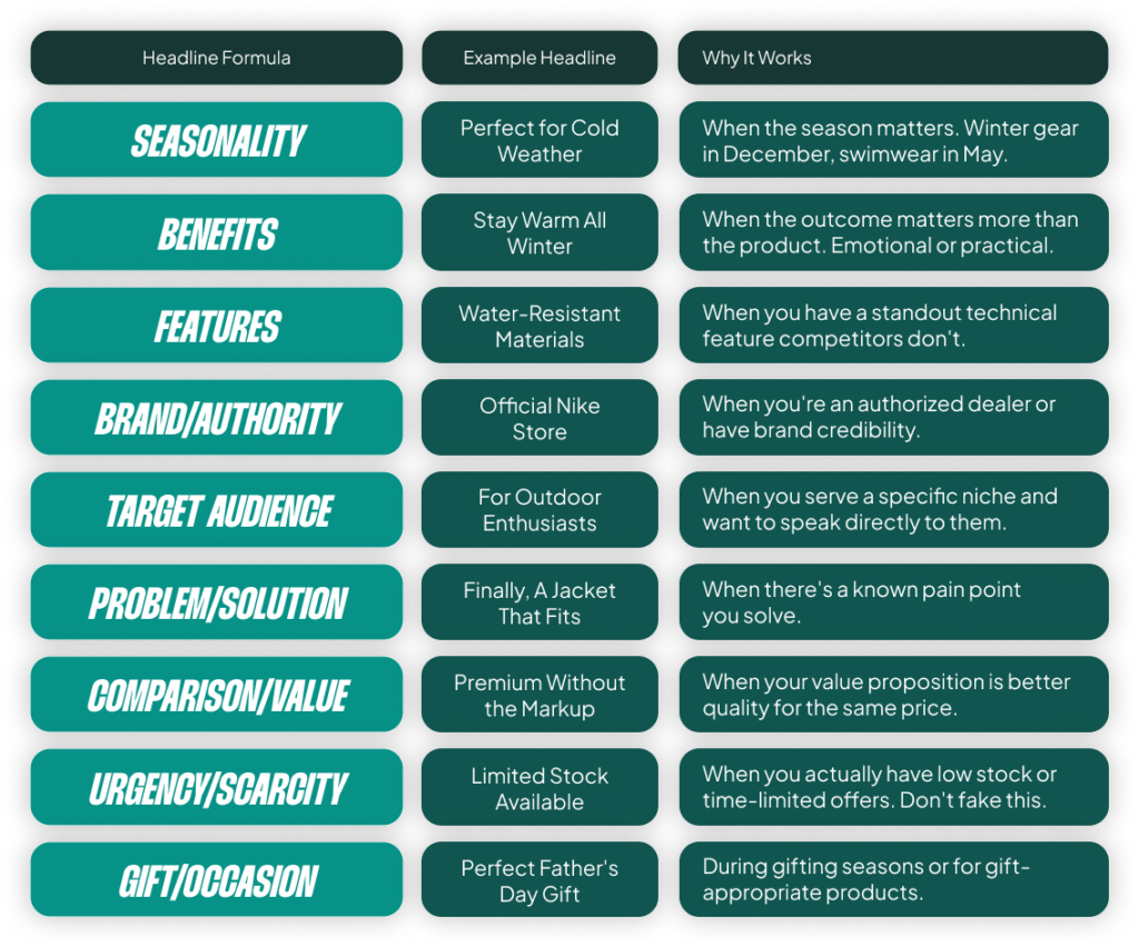 - Stop med at skrive 15 tilfældige, ensartede overskrifter. Start med fem unikke overskrifter baseret på “de fem kerneformler” (Søgeord, Fordele, Tillid, Features, CTA).