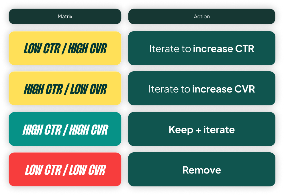 - Brug en fire-kvadrants-matrice (CTR vs. konverteringsrate) til at diagnosticere, hvad der er galt med underpræsterende overskrifter, og beslut, om de skal justeres eller fjernes.