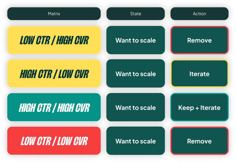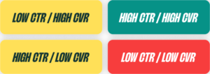 Jeg bruger en simpel matrice til at gruppere overskrifter i fire kvadranter baseret på deres klikrate (CTR) og konverteringsrate (CVR). Målet er at finde ud af, hvad vi skal gøre med hver overskrift for at flytte den op i øverste højre kvadrant.